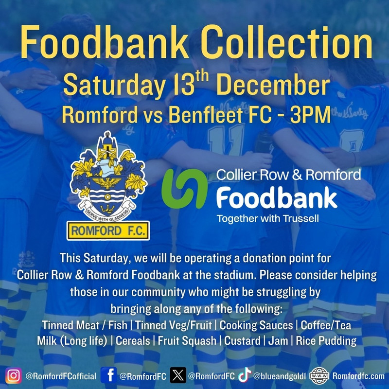 When Romford play Benfleet at Mayesbrook Park on Saturday, the club will be operating a donation point for the Collier Row & Romford Foodbank. Any donation you can make will be appreciated.