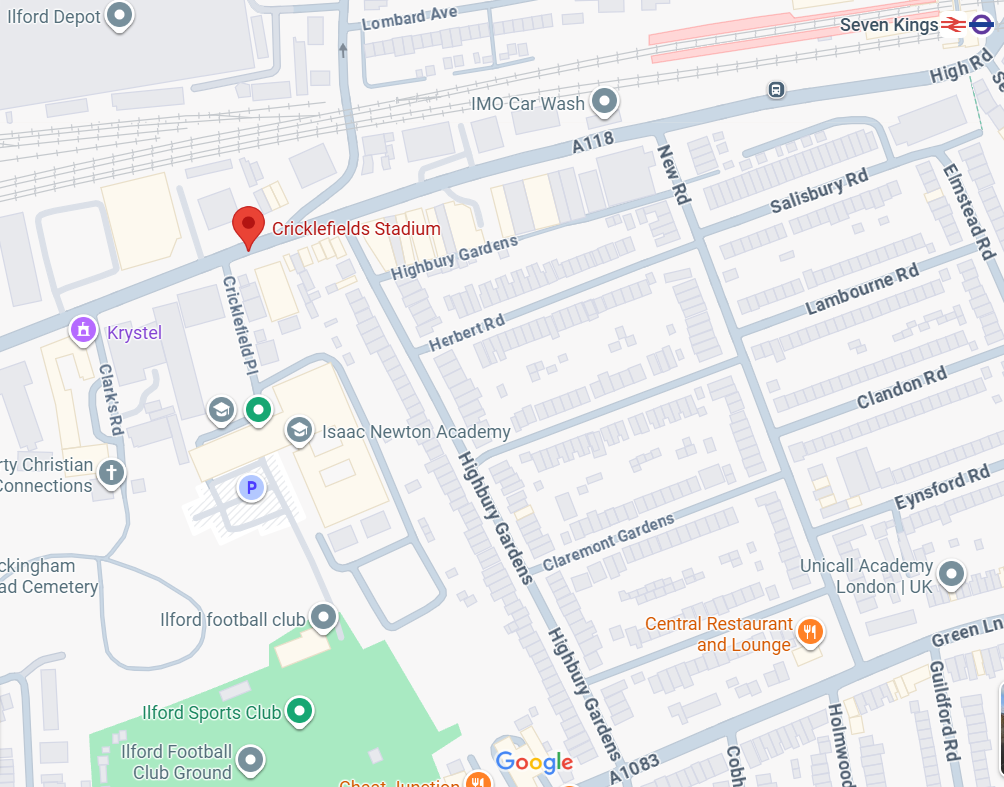 Tomorrow’s game will be played at Cricklefield Stadium, Ilford IG1 1FY. The ground is just off High Road and is a short walk from Seven Kings Station. The number 86 bus stops near to the entrance to the ground.