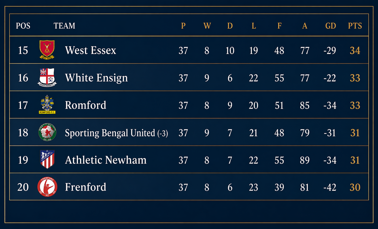 Frenford – who have occupied bottom place in the table for much of the season – could avoid the drop if they win at home against West Essex and both Sporting Bengal and Athletic Newham lose, which would be a remarkable achievement and truly a Great Escape!