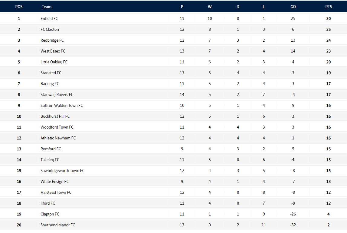 Ilford currently sit third from bottom with 12 points from 11 games, of which they have lost seven, but aside from a 6-1 defeat at Saffron Walden Town, all of their games have been close affairs, and last Saturday they were only narrowly beaten 3-2 by league leaders Enfield. Their wins include a 2-0 victory over Barking and a 3-0 win at Sawbridgeworth Town.