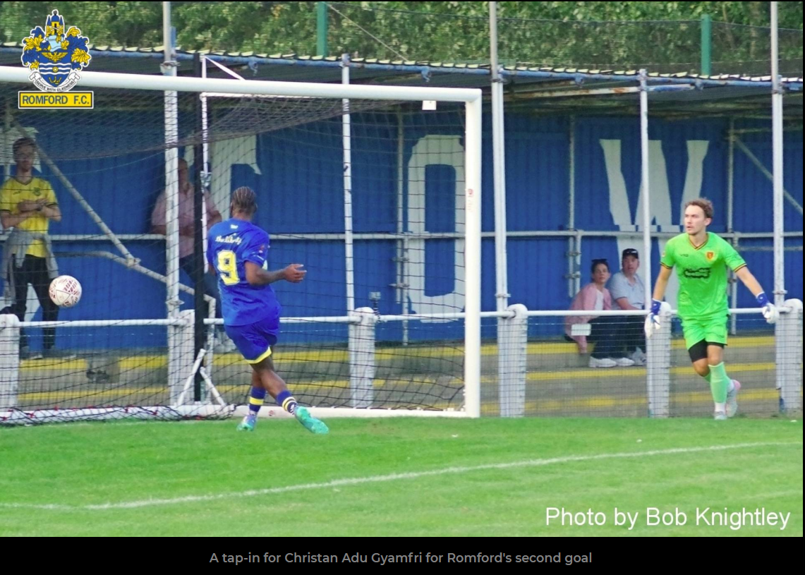 Last season, Romford were 3-1 winners against West Essex on their patch despite being reduced to nine men with almost half an hour remaining. Goals by Arnold Mengi and Brendan Ocran had Boro 2-0 up at the break, but in the aftermath of a West Essex penalty that was converted to make it 2-1, goalkeeper Harry Girling was sent off, joining Derek Feyi in the dressing room, the Boro defender having been dismissed ten minutes earlier. Andy Morris went between the posts, but Boro not only held out, but went on to grab a third goal when Arnold Mengi scored ten minutes from time. The return game was rather more mundane, with Amaree Robinson-Jones scoring the only goal in the fixture at Mayesbrook Park.