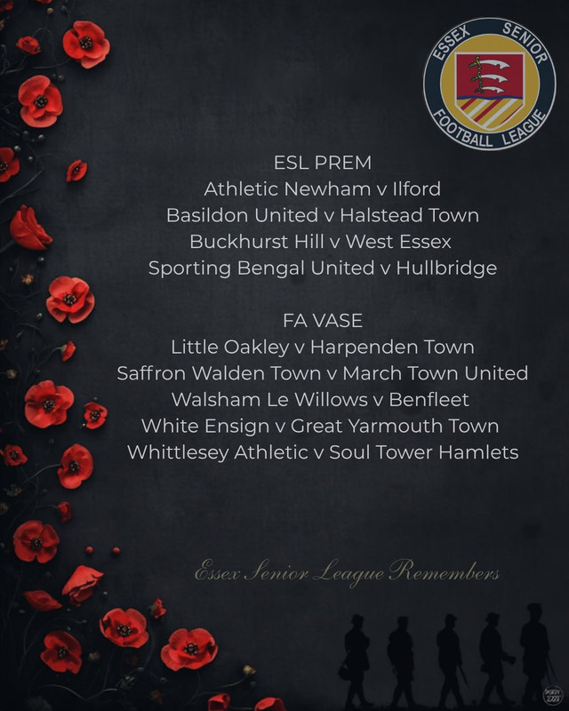 Tomorrow, all Essex Senior League matches - and FA Vase ties involving ESL clubs - will pause for a 2-minute silence for Remembrance Weekend.